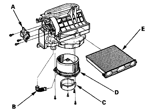 - The recirculation control motor (A), blower motor cooling hose (B), blower motor cover (C), the blower motor (D), and the dust and pollen filter (E) can be replaced without removing the blower unit.
