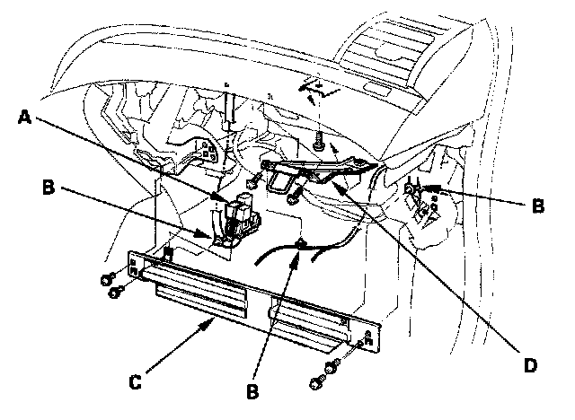 2. Remove the relays (A) and the wire harness clips (B), then remove the bolts and the glove box frame (C). Remove the self tapping screws, and the glove box striker (D).