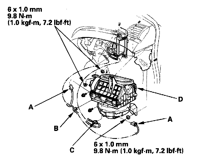 3. Disconnect the connectors (A) from the blower motor, and the recirculation control motor, then remove the wire harness clip (B) and the connector clip (C). Remove the mounting nuts, the mounting bolts and the blower unit (D).