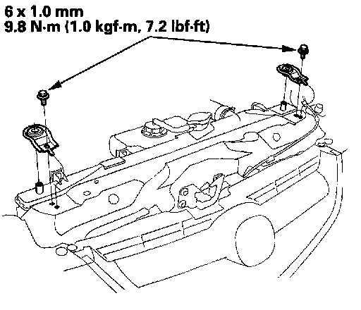 6. Remove the bolts and the radiator upper mount brackets.