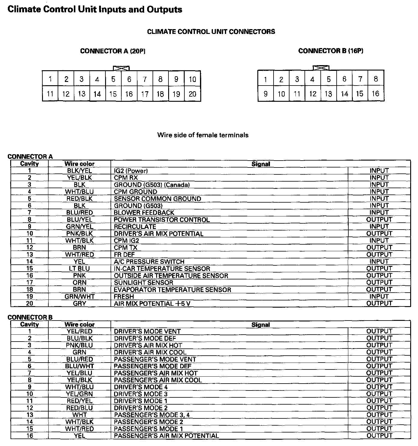 Climate Control Unit Inputs And Outputs: