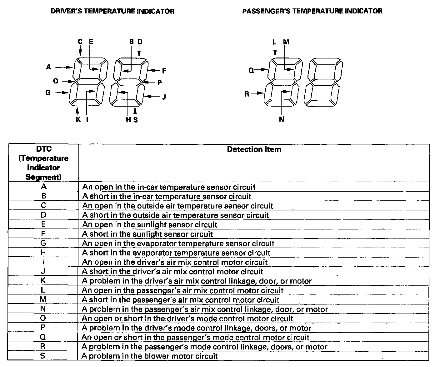 To retrieve the DTC, you must run the self-diagnostic function. In the case of multiple problems, the respective indicator segments will come on. If indicator segments A, C, E, G, I, L, O and Q come on at the same time, there may be an open in the common ground wire.