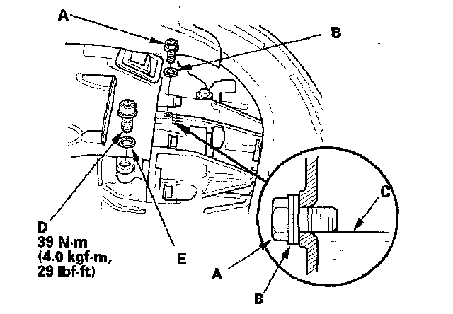3. Remove the oil check bolt (A) and washer (B). Check the condition of the fluid and make sure it is at the proper level (C). If the fluid is dirty, remove the drain plug (D) and washer (E).