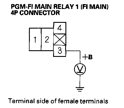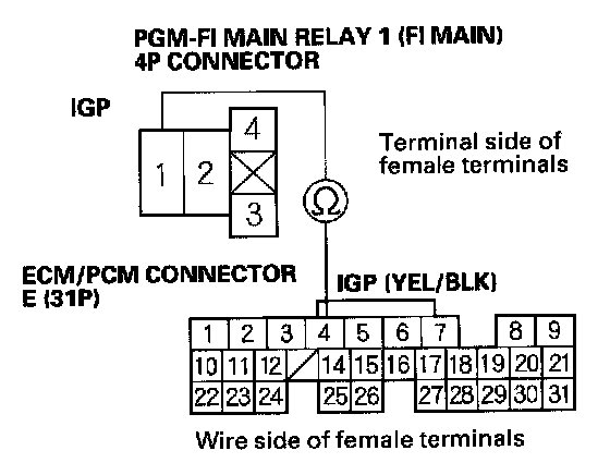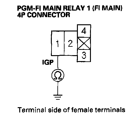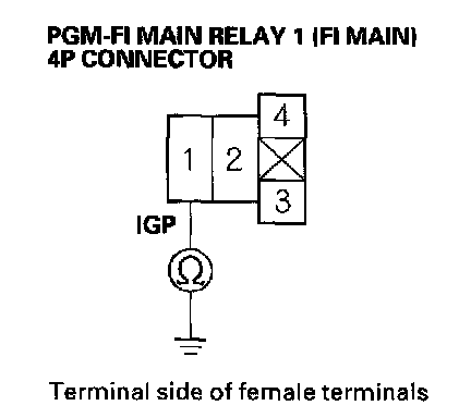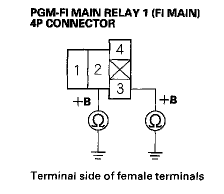 27. Check for continuity between body ground and PGM-FI main relay 1 (FI MAIN) 4P connector terminals No.2 and No.3 individually.
