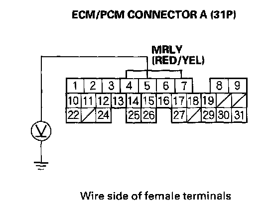 30. Check for continuity between PGM-FI main relay 1 (FI MAIN) 4P connector terminal No.1 and body ground.