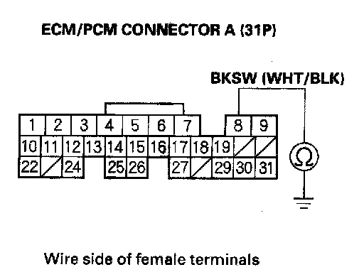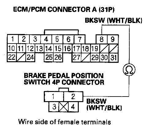 9. Check for continuity between ECM/PCM connector terminal A8 and brake pedal position switch 4P connector terminal No.2.