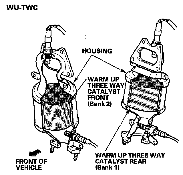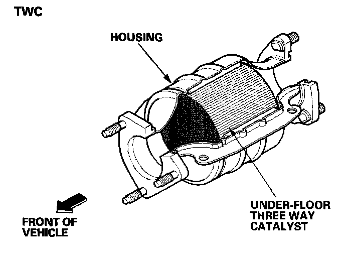 The WU-TWC/TWC converts hydrocarbons (HC), carbon monoxide (CO), and oxides of nitrogen (NOx) in the exhaust gas to carbon dioxide (CO2), nitrogen (N2), and water vapor.