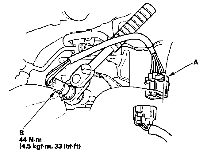 1. Disconnect the rear A/F sensor 8P connector (A), then remove the rear A/F sensor (B).