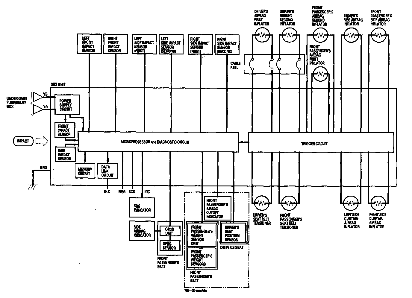 The main circuit in the SRS unit senses and judges the force of impact and, if necessary, ignites the inflator charges. If battery voltage is too low or power is disconnected due to the impact, the voltage regulator and the back-up power circuit will keep voltage at a constant level.