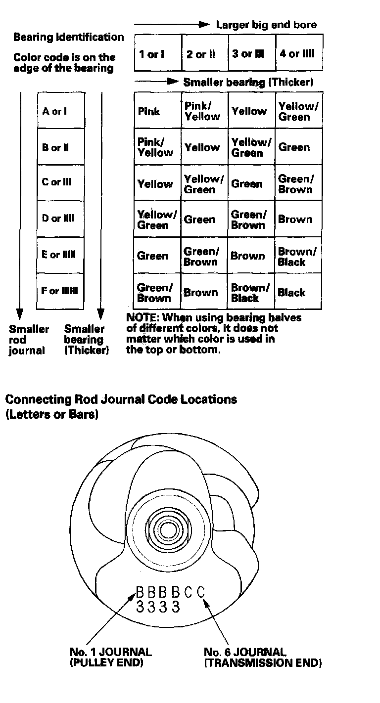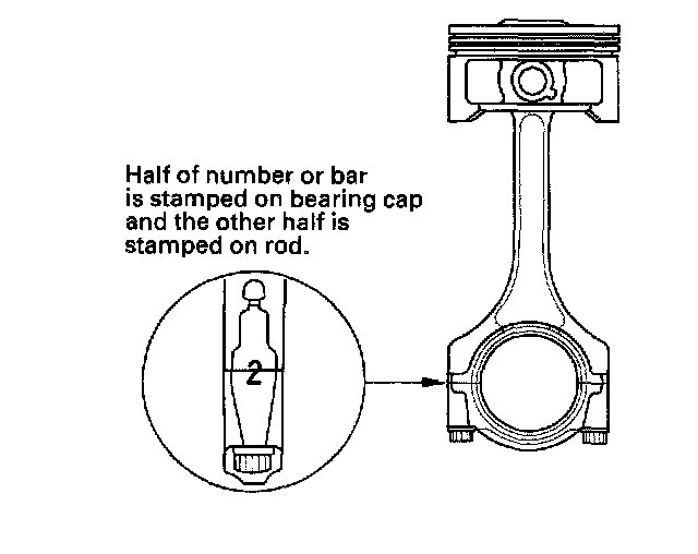 Numbers or bars have been stamped on the side of each connecting rod as a code for the size of the big end. Use them, and the letters or bars stamped on the crank (codes for rod journal size), to choose the correct bearings. If the codes are indecipherable because of an accumulation of dirt and dust, do not scrub them with a wire brush or scraper. Clean them only with solvent or detergent.
