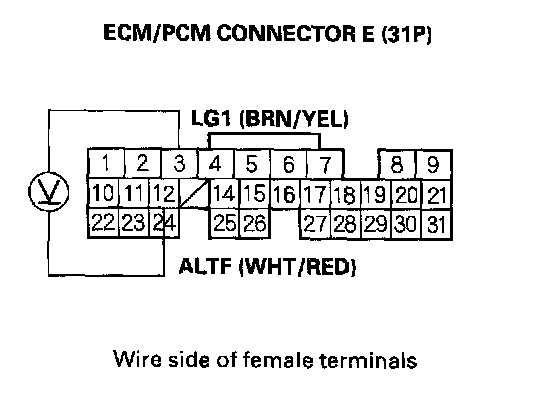 7. Measure voltage between ECM/PCM connector terminals E3 and E12.