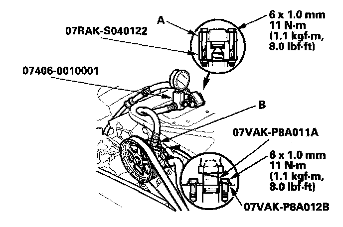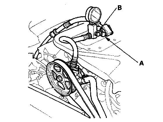 3. Disconnect the pump outlet hose (A) from the pump outlet with care so as not to spill the power steering fluid on the frame and other parts, then install the P/S joint adapter (pump) on the pump outlet (B) with the P/S joint outlet plate.