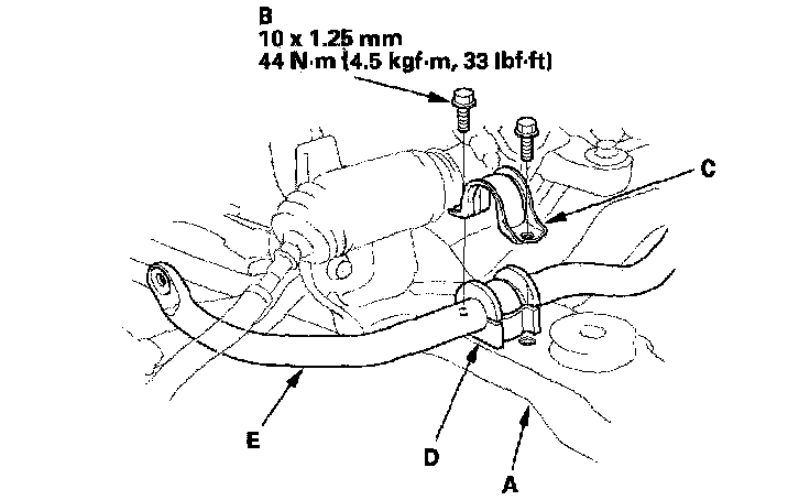 5. Remove the flange bolts (B) and bushing holders (C), then remove the bushings (D) and the stabilizer bar (E).