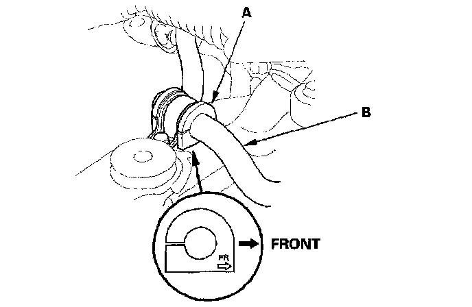^ Do not set the bushing (A) on the bent or curved part of the stabilizer bar (B).