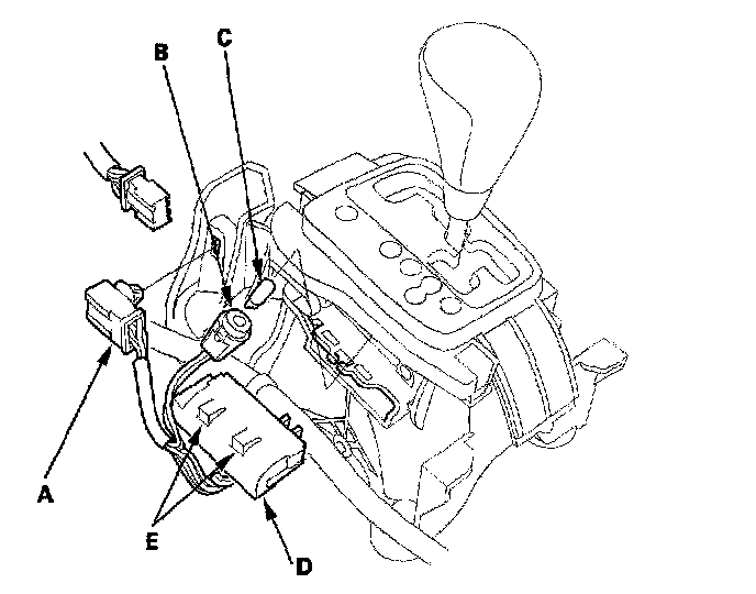 4. Remove the transmission gear selection switch/park pin switch (D) by releasing the lock tabs (E).
