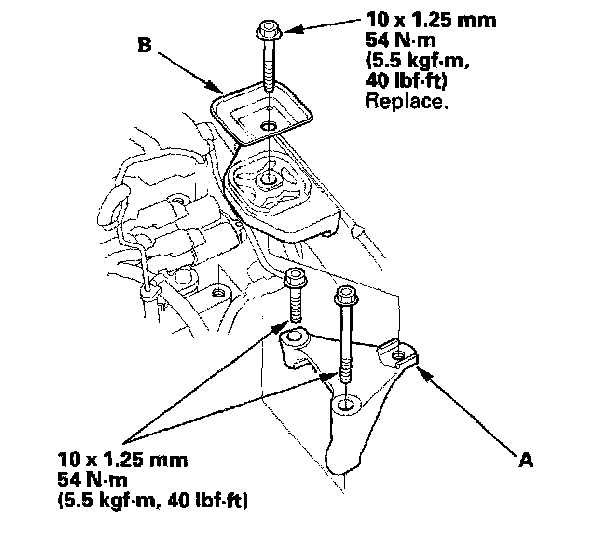 6. Remove the transmission upper mount bracket (A) and bracket plate (B).