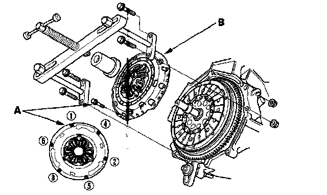 8. Be careful not to damage the pressure plate (A). Tighten (180 degrees apart) the pressure plate mounting bolts (B) in the pattern as shown in several steps.