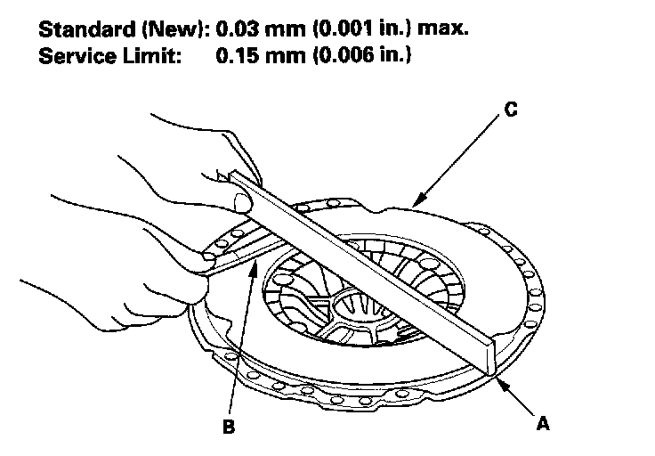 8. Inspect for warpage using a straight edge (A) and a feeler gauge (B). Measure across the pressure plate (C). If the warpage is more than the service limit, replace the pressure plate and clutch disc as a set.