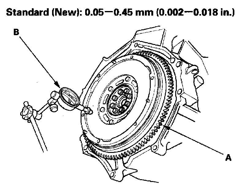 3. Measure the flywheel (A) runout using a dial indicator (B) through at least two full turns with the engine installed. Push against the flywheel each time you turn it to take up the crankshaft thrust washer clearance. If the runout is not within the standard, replace the flywheel, and recheck the runout. Resurfacing the flywheel is not recommended.