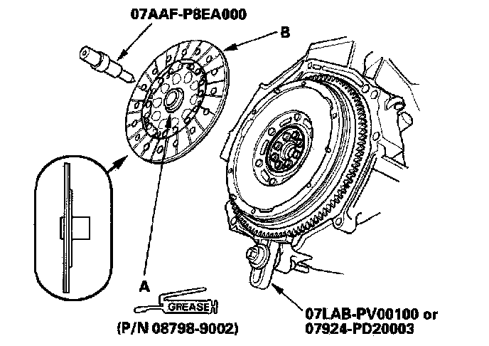 3. Apply super high temp urea grease (P/N 08798-9002) to the splines (A) of the clutch disc (B), then install the clutch disc using the special tools.