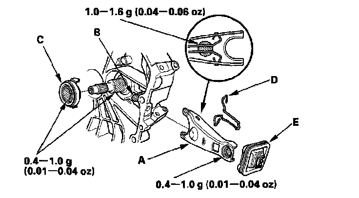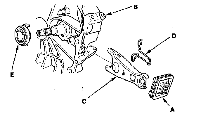 2. Remove the release fork (C) from the clutch housing by squeezing the release fork set spring (D). Remove the release bearing (E).