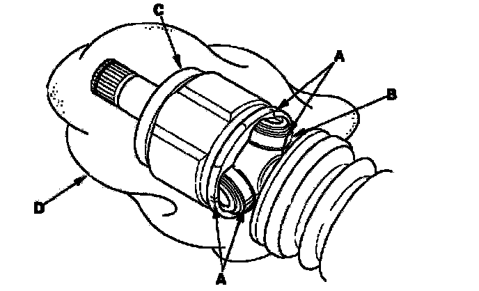 3. Make a mark (A) on each roller (B) and inboard joint (C) to identify the locations of rollers and grooves in the inboard joint. Then remove the inboard joint on the shop towel (D). Be careful not to drop the rollers when separating them from the inboard joint.