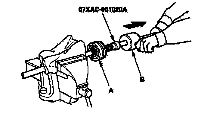 6. Remove the outboard joint (A) using the special tool and a commercially available 5/8"-18 UNF slide hammer (B).