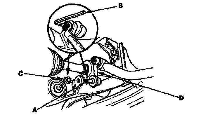 6. Hold the stabilizer ball joint pin (A) with a hex wrench (B), and remove the flange nut (C). Separate the front stabilizer link (D) from the lower arm.
