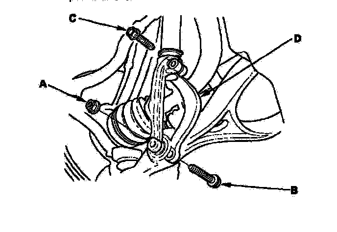 7. Remove the self-locking nut (A), 12 mm flange bolt (B), and 10 mm flange bolt (C), then remove the damper fork (D).
