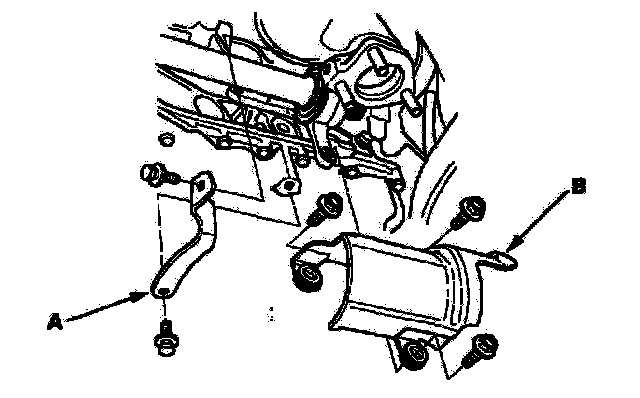4. Remove the exhaust pipe bracket (A) and heat cover (B).
