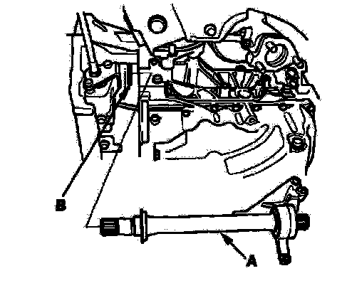 6. Remove the intermediate shaft (A) from the differential. Hold the intermediate shaft horizontally until it is clear of the differential to prevent damage to the differential oil seal (B).