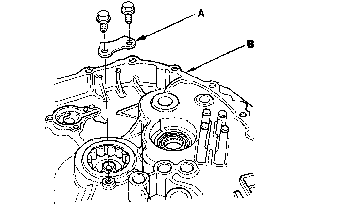 1. Remove the bearing set plate (A) from the clutch housing (B).
