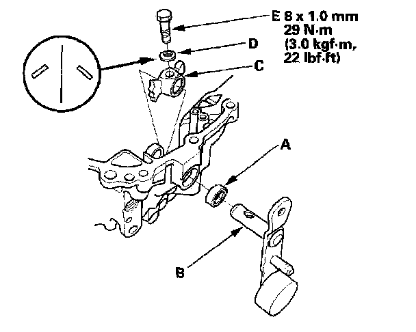 1. Press the new dust seal (A) into the transmission housing surface, then install the change lever (B), shift arm (C), 8 mm spring washer (D), and 8 mm special bolt (E).