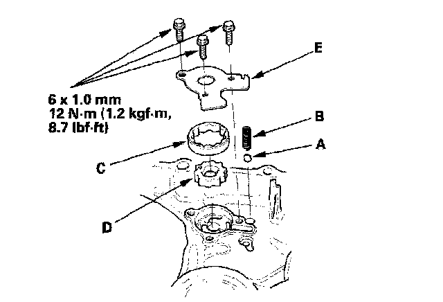 3. Install the steel ball (A), relief valve spring (B), oil pump outer rotor (C), oil pump inner rotor (D), and oil pump plate (E).