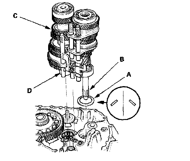 6. Apply tape to the mainshaft splines (B) to protect the seal. Install the mainshaft and countershaft (C) into the shift forks (D) as an assembly.
