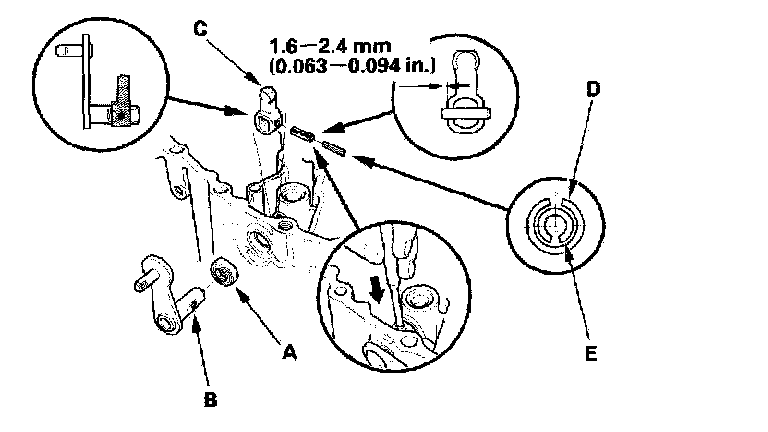 7. Press the new dust seal (A) into the clutch housing surface, then install the select lever (B), select arm (C), new 5 mm spring pin (D), and new 3 mm spring pin (E).