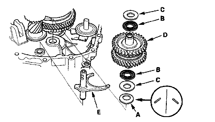 11. Install the 20 mm thrust needle bearings (B), 20 mm thrust washers (C), reverse idler gear shaft assembly (D), and reverse shift fork (E) as an assembly.