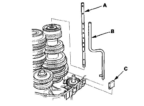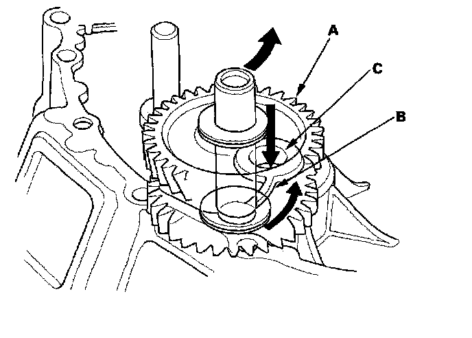 12. Slide the reverse idler gear shaft assembly (A) on the rib (B) of clutch housing, then install it into the hole (C) of the clutch housing.