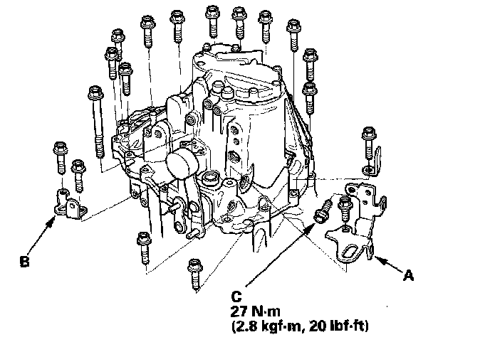 21. Install the transmission hanger (A), transmission hanger (B), 8 mm flange bolt (C), and the 10 mm flange bolts, finger-tight.