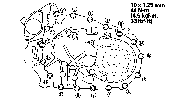 15. Remove any dirt and oil from the transmission housing sealing surface. Apply liquid gasket (P/N 08718-0001 or 08718-0002) to the sealing surface. Make sure you seal the entire circumference of the bolt holes to prevent oil leakage.