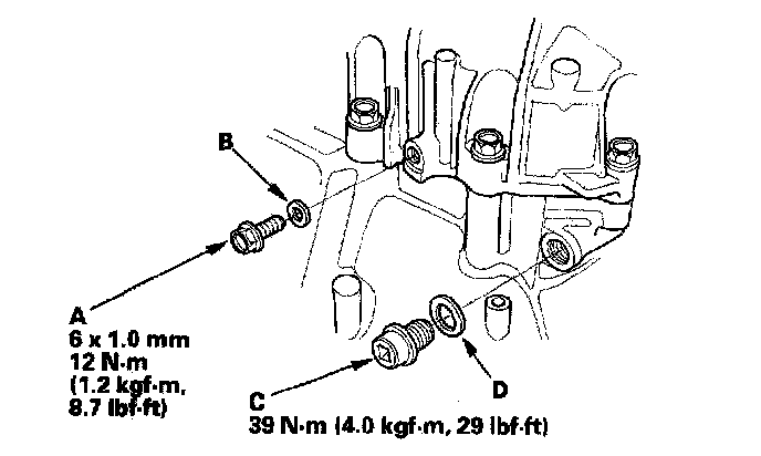 23. Install the oil check bolt (A), new 6 mm washer (B), drain plug (C), and new 14 mm washer (D).