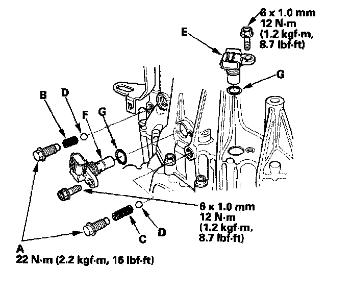 24. Apply liquid gasket (P/N 08718-0001 or 08718-0002) to the set screws (A), then install the set screws, 22.0 mm spring (B), 27.4 mm spring (C), steel balls (D), input shaft (mainshaft) speed sensor (E), output shaft (countershaft) speed sensor (F), and new O-rings (G).