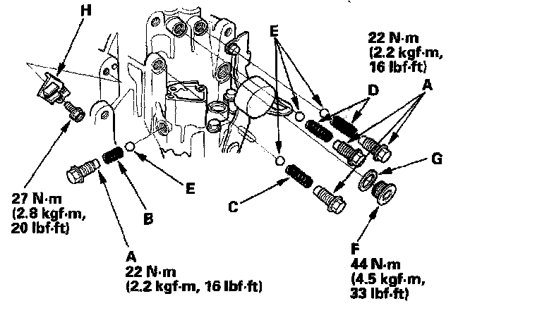 25. Apply liquid gasket (P/N 08718-0001 or 08718-0002) to the set screws (A), then install the set screws, 22.0 mm spring (B), 26.1 mm spring (C), 27.4 mm springs (D), steel balls (E), oil filler plug (F), washer (G), and clutch line bracket (H).