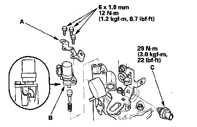 28. Apply liquid gasket (P/N 08718-0001 or 08718-0002) to the threads of the back-up light switch (C), and install the switch in the transmission housing.