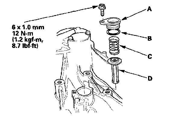 29. Install the strainer cover (A), new O-ring (B), strainer set spring (C), and oil pump strainer (D).