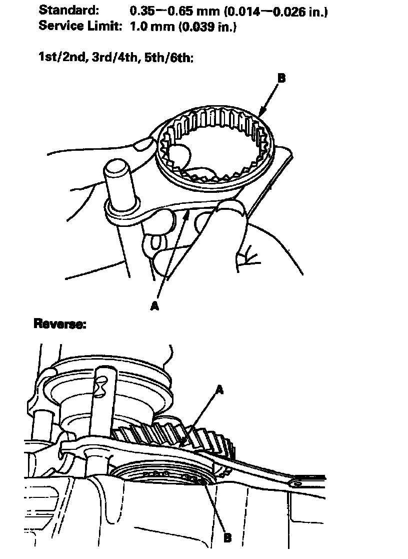 1. Measure the clearance between each shift fork (A) and its matching synchro sleeve (B). If the clearance exceeds the service limit, go to step 2.