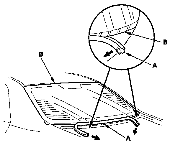 6. Remove the molding (A) from the lower edge of the rear window (B). If necessary, cut the molding with a utility knife.