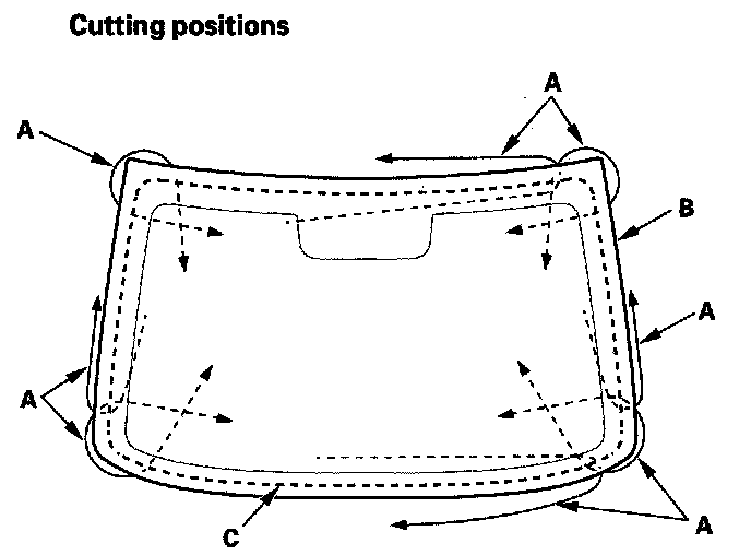 7. With a helper on the outside, pull the piano wire (A) back and forth in a sawing motion. Hold the piano wire as close to the rear window (B) as possible to prevent damage to the body, and carefully cut through the adhesive (C) around the entire rear window.