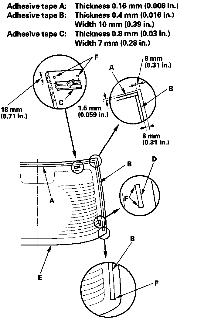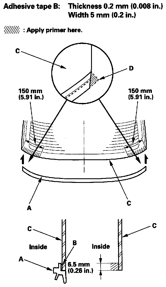 12. Attach the upper rubber dam (A), side rubber dams (B) with adhesive tape A, clips (C) with adhesive tape B, and fasteners (D) with adhesive tape C to the inside face of the rear window (E) as shown: