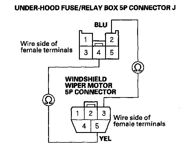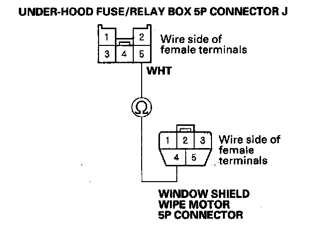 15. Check for continuity between the No. 4 terminal of the windshield wiper motor 5P connector and No. 5 terminal of the under-hood fuse/relay box 5P connector J.